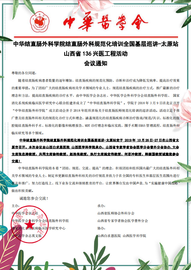 转播+网络直播|中华结直肠外科学院结直肠外科规范化培训全国基层巡讲-太原站山西省136兴医工程活动